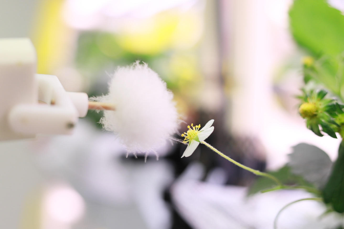 果実が実るためにはミツバチや人力などを用いた授粉が必要ですが、それらにはさまざまな課題があります。ロボットによる全自動授粉を行うことで衛生的で安定的ないちごの生産を実現します。